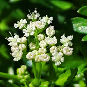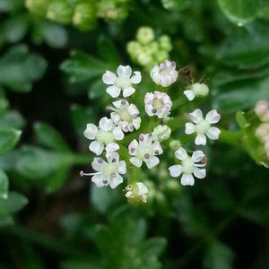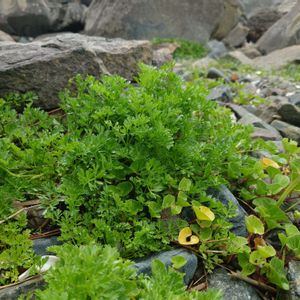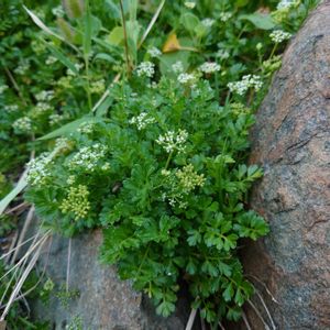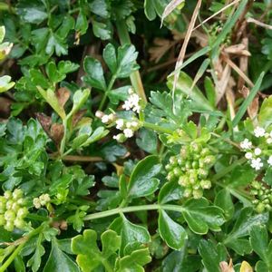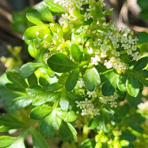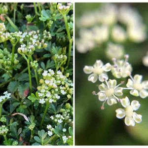ハマゼリ (浜芹) セリ科 ハマゼリ属 8~9月 15~20cm 在来種 海岸砂地や岩壁の隙間、岩棚などに生え、風衝地では茎は地表を這って分枝を繰り返し広がる 葉は単羽状複葉で厚みと光沢がある✨ 小葉は羽状に切れ込み、裂片は短く先は鈍形 花は白色で、小形で疎らな複散形花序に付く 花径約2mm 花弁の先は内側に曲がる