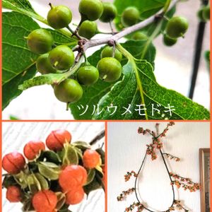 ツルウメモドキ🔴🟡 散歩道で夏に蔓を見つけて、ずーっと成長を観察してきたツルウメモドキの実が大きくて艶々になったので先日✂️してきました🌿🟢🌿🟢 日の当たらない地下で殻が割れるのを待って枯れ葉を取りスワッグ風になりましたよ・゚´🌕੭・🌕੭・゚´ (明るいところに置くと殻の緑色が抜けてしまいます💦) この形は自然に蔓が絡んだままで、私は手を加えてません😌👋👋 (˶ᵔ ᵕ ᵔ˶)秋の色~