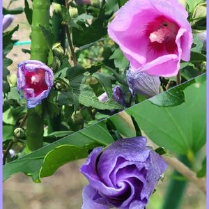 1️⃣ 今日のお花 ムクゲ 昨夜から強風でムクゲは開けないようです😅🌿🌿 下のくるくるは“夏空”の蕾 やっと咲きそうな3年目の小さな木ですが強風で足踏み状態です💦 2️⃣ そして叔母からSOSが( ̄□ ̄;)!! 強風でモロッコいんげんの根が抜けて支柱ごと倒れたよ‼ 収穫しちゃうから手伝って୧((〃•̀ꇴ•́〃))! 10株ほどですが叔母の大好物のお豆が一大事なので手伝い、お裾分けを貰いました😂 下は、葉っぱが急に枯れたから掘ったというじゃがいも🥔 レッドムーンとデストロイヤーとなんちゃららしい😋 デストロイヤーっていうお芋があるのね🤭