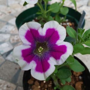 挿し芽っ子のペチュニア レイ ヒッピーチックバイオレットのお花が咲いたので📷️ 親株は主人の管轄ですが😁植え付けの時に摘芯して捨ててあるのを私がいただいて挿し芽を😜 根が出るのも早く発根率100パーセントの生育旺盛なペチュニア🏵️ 親株に追い付け追い越せ~💨