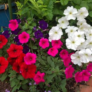 こんばんは🌇🌙 お仕事 お疲れ様です。 赤、ピンク、白と 縦に並んで 綺麗に咲いてる ペチュニアです。 鮮やかな自然の色です。 眩しくて ゴメンナサイ! 自然が織り成す発色です。 この両サイドに 大きめのバラがあります。 どちらも ツボミでいっぱい♡ 今にも咲きそうです。 ペチュニアには、 どんどん咲いてくれて いつも綺麗です。 では、 本日も皆様、 ありがとうございました。