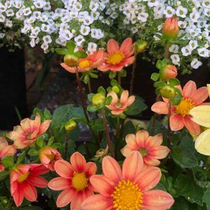 おはよう😃御座います。 朝の水やりをしてきました^_−☆ ちょっと疲れたケド、 綺麗に咲いてる お花たちが 枯れない様にネ。 暑くなる時は朝晩水やりですね。 写真は、 小輪ダリア スイート ハート です。 上にある、 アリッサムにつぶされない様に しないとね。 アリッサム、 モフモフのふわふわです。 凄く増えました。 可愛いオレンジ色の 小さいダリア、 可愛い😍です。 でも 、 意外と 茎は硬くて丈夫なです。 何やら 雨に弱いみたい…… 耐暑性も強くて、 これからの暑さに 頑張ってくれそうな 期待の お花 です。 隣に、 黄色もあります! グラデーションで綺麗ですが、 今回は、 オレンジのみで♡ 皆様本日、 素敵な日を お過ごし下さいネ。