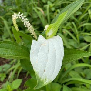 半夏生。(長文)〈半化粧、片白草(かたしろぐさ)とも〉夏至(6月21日)から11日目(7月2日頃)を半夏生と呼ぶ。その頃に花を咲かせるところから名付けたのに、一昨日、里山の空き地に自生しているのを見つけた。どういう風の吹き回しか、かなり遅い開花だ。 花は花弁がなく、紐状の花穂(かすい)にごく小さい花がつく。この花穂が出ると葉はベタっと白くなる。つまり、花があまりに小さいので、昆虫を誘うことができないのが悩みだったハンゲショウの知恵。 苦肉の策で花に近い方の葉を半分以上白く「半化粧」して目立たせた。昆虫をおびきよせ受粉させる役目だ。結実する頃には白い葉の必要はなくなり、元の緑の葉に戻る。 どうやら白い葉になると光合成ができないため、それなりにエネルギーを使うのかもしれない。 白い葉は、ハンゲショウが、がんばっているシルシだった。