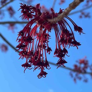 フサザクラ(房桜)と見立てていましたが、プリプラさんから、ハナノキと教えていただきました。 花の木。ハナカエデとも。ムクロジ科カエデ属。樹高20〜25mの落葉広葉高木。本州の中部地域で見られるとか。山野の湿地に自生していて、数はそれほど多くないようだ。 雌雄異株で、これは雌花。葉が出る前に開花するので、あざやかな真紅が際立ち、目を惹かれる。花の茎を伸ばして咲くのが雌花で、優雅。黒っぽいプロペラ状の種が見えている。雄花は枝から直接咲く。 5月にはプロペラが束になり、赤みを帯び、華やかなカンザシ風になってぶら下がる。 葉は、浅い三裂と深い三裂があり、一定ではない。 花の木の名の通り、春を謳歌している樹木である。