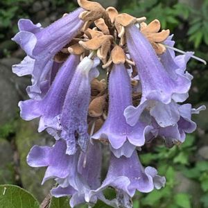 桐。(長文)桐は樹高10~15mにもなる高木のため、遠目に紫の花が上向きに咲いていると思い込んでいた。首相の記者会見の演題につけられている「五七の桐」の紋章も桐の葉三枚に桐花が上向きなっていたせいもある。左右の花が五で真ん中の蕾が七の意味らしいが、図案は花も蕾も同じに見える。 こんな間近で桐の鐘型の花を見たのは、初めて。たまたま渓流沿いの堤防脇から目線の高さに生えていたため、最初はすぐ桐の花とはわからなかったほど。思った以上に花が大きかった。強い芳香があるのに手が届かなかったので、嗅いでいない。 桐は日本の樹木の中で最も軽く(桐の比重が0.19〜0.30。杉=0.38、カラマツ=0.50、ケヤキ=0.69、黒檀=1.16。比重が1より小さいと水に浮く。)、また湿度の透過性、熱伝導率が極めて小さい。 タンスで考えると、湿気がある時はふくらんでタンスの機密性をよくし、乾燥時は隙間をつくり、通気がよくなる。木が呼吸するように乾湿調整をしてくれるので、衣類の保存には最適。 また熱伝導率が低いのは、着火点が高く燃えにくいことを意味する。金庫の中に桐を張るのは、火災などで外側の金属が熱くなっても内側は燃えにくく、自然発火しにくくするため。金庫内に札束が入っていてもまず燃えない。 もっとメリットもあるが、「キリ」がないのでこのくらいにする。ダジャレはさておき、「キリがない」は桐ではなく「切り」と書く。高温多湿の日本で桐は古来より重宝されてきた証しであろう。