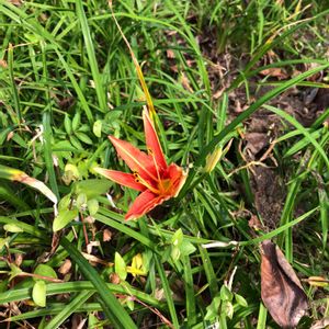 トキワカンゾウ(アキノワスレグサ) 常緑多年草 丈40cm位 花径は8cm 一日花 日陰の西日ガンガンエリア 葉は冬も枯れず、少し厚みがあり、雑草にない光沢が有ります。根元から束になって扇形になっていて生え方も整っています。観葉植物のようです🌱 トキワカンゾウは水生植物、湿性植物と書かれていやすが、乾燥にすごく強いです💪 通称のような感じでノカンゾウと言われてますがノカンゾウは冬は葉が枯れます。※ちなみにノカンゾウにそっくりなハマカンゾウと言う海岸に咲く常緑の種類もあるそうです😊