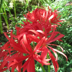 こんにちは😃 赤いヒガンバナが咲いています❤️ でもちょっと違うような? 花弁が細くてシベがないみたい。 名前教えて頂きました。ありがとうございます😊