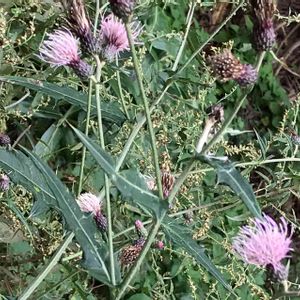 ヨシノアザミ 開花が進んでいるところです🌸 アザミは春だけじゃないんですね😲 和名は地名でなく、発見者(吉野善介)の名に由来する。ナンブアザミの変種。タイアザミ(トネアザミ)やナンブアザミに比べると頭花がやや小さく、数多くつき、総苞はやや短い鐘形で、粘着することもある。総苞片は8~9列つき、短く、剛刺針も短く、その先端はやや反り返る程度である。 花期8~10月 類似種のノアザミは春~初夏に咲き、花の首がネバネバする。花の数が少ない。