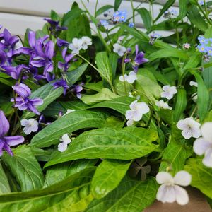 *スミレ* 放置していたプランターに紫と白いスミレが咲いて来ました。1株残っていたワスレナ草とのコラボが綺麗です。💜💙💚
