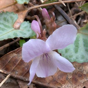 可愛いです♪ アケボノスミレ(曙菫) スミレ科 スミレ属 多年草 北海道、(渡島半島)、本州、四国、九州に分布。 太平洋側の山地の林床や林緑に生育。 和名は曙菫で花色を夜明けの空色にたとえたもの。 高さ10〜15cm。 葉は円心形。2〜5個が束生し、花期には内側に巻き込んで菱形。縁に円い鋸歯。 花柄は長さ10〜15cm。 花は直径2〜2.5cm。紅紫色、または淡紅紫色。 側弁基部は無毛、まれに毛がある。 距は短く先が円い。 花柱はカマキリの頭形。 花期3〜5月 4月20日撮影 白河市 天狗山