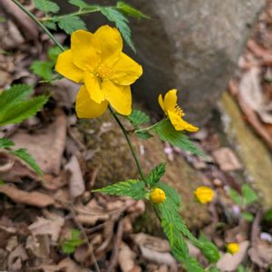 今日のお花 ヤマブキ(山吹) バラ科 ヤマブキ属 落葉低木 北海道、本州、四国、九州に分布。 山地に生育。 枝は初期に緑色、後に褐色。 葉は互生、三角状卵形〜長卵形。葉先が尾状に伸び、葉脈が深く目立つ。 花は直径2.5〜6cm、黄色の5弁花。先がわずかに凹む。 萼片は花弁と同長〜1/4。果期にも残る。 雄しべは多数。花柱は糸状。 痩果は1〜5個固まってつき褐色。 花期4〜5月 4月20日撮影 白河市 天狗山