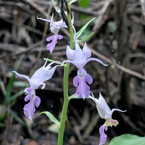 今年はどことなく弱々しいです。 来年咲くのか心配です。 ナツエビネ(夏海老根) ラン科 エビネ属 多年草 和名は日本のエビネ属の中で、本種だけが夏に咲くことによる。 北海道〜九州に分布。 丘陵帯〜山地帯の湿り気のある場所に生育。 高さ20〜40cm。 葉は3〜5個束生し、長さ10〜30cmで縦じわが目立つ。 花径2〜3cmほどで、淡紫色の花を多数つける。 萼片、花弁は反り返り、唇弁は基部で深く3裂し、距はない。 花期7〜8月 8月3日撮影 福島県南部