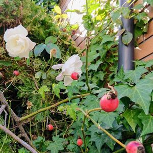 🌿🤍❣️白い薔薇とローズヒップ❣️🤍🌿 買い物途中のチェックポイント いろんな植物と絡まり合いながら、2階くらいの高さで咲いているんです。