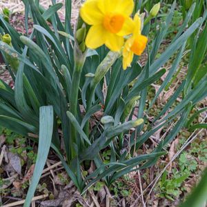 黄色水仙。東側入口付近です。庭が広いから、アチラコチラ〜水仙の芽が出てきてます。🤔🙄😱今では、白色が出てくるのか黄色が出てくるのか、解らない程です。😅🌼💐☀️🥳