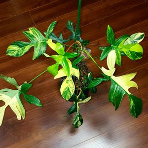 フィロデンドロン フロリダビューティー 斑の色が徐々に変わります。 初めはライムグリーンから黄色そして白い斑になり色が変わるのと平行して徐々に葉の大きさも大きくなり一番大きい葉で直径30センチになります。