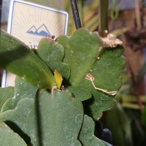 ❁ ❁ ❁ お迎えしてからちょうど1ヶ月の “リプサリス クリスパータ”です🌵 先々週だったかな?植え替えしてみると、葉挿しからようやく根が出た状態だったので正直「大丈夫?」と心配になりました。 ところが… …と、その前に、実は12年ぶりに仕事に就くことになり今日は初出勤日でした。 そんなわけでクタクタになって帰宅し落ち着いた頃に発見したのです。 クリスパータの葉先に何かがある! あるけど、この色大丈夫⁉︎ とりあえず動きがあったのはイイことです😁 ❁ ❁ ❁