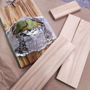 こんにちは、こんばんは ベイチーの合板にカビ生えたり接合部分解して来たので板替えしました。 1枚板だと反ったり割れたりするのも嫌なので細いヒノキを2枚連結して作ります。 裏側のネジ固定部分は割れないようにあらかじめドリルで穴開けて対策。 最初はネジを縦にしましたが、横一列のほうが良かったことに気付いて変更しています(笑) あとは株を乗せ換えてテグスでぐるぐる。 ある程度乾いていたのでたっぷり水を含ませたらめっちゃヒノキのいい香りが(笑) そんな暇つぶしでした。