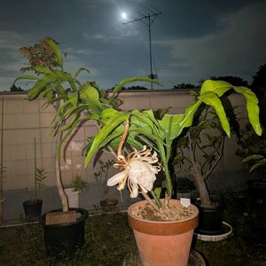 月下美人が満月に照らされ甘く品の良い香りを漂わせ咲きとても神秘的な光景です。そして今夜は特に風が吹いているのでよく香り月夜に淡く光るように咲き誇る花がとても美しくいつまでも眺めていたくなりますね!花言葉は儚い美、儚い恋、艷やかな美人、ただ一度だけ会いたくてなど!