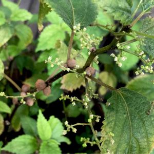 8月3日撮影 都立薬用植物園 ムカゴイラクサ イラクサ科ムカゴイラクサ属 大きな札が立っていて、そこには赤、黒、黄色で 「さわらないで❗️ さわると刺されます。 有毒なトゲにご注意ください」 と書いてありました。 イラクサに似ていて、葉腋にむかごをつけることからこの名がある。 山地の陰湿地に生える雌雄同株の多年草で、高さ40-80cmになる。根は紡錘状に肥厚する。 同属のミヤマイラクサと同じく、茎や葉、葉柄には触ると痛い刺毛があるがミヤマイラクサよりだいぶ少ない。葉腋に直径約5mmのむかごをつけるのが大きな特徴。ミヤマイラクサほど認知されていないが山菜としても利用される。むかごも食べられる。 葉は長い柄があって互生し、長さ5-15cm、幅3-6cmの狭卵形~卵状楕円形で基部は円形~鈍形、先はとがり、縁に粗く低い同形の鋸歯がある。刺毛が散生し表面に細点がある。 雄花序は無柄で下方の葉腋から長さ4-7cmの円錐状に垂れ下がるように、雌花序は長さ4-7cmで茎の頂部の葉腋から直立してつく。雄花の花被片は4-5個で雄しべも同数。雌花の花被片は4個で、2片は花後長さ2.5cmほどに増大し、痩果と同じ長さになり、痩果を包む。柱頭は長い線形で白色。 痩果は先がくぼんだ卵円形で長さ2.5-3mm。 (素人植物図鑑 より) 茎にトゲがあるのは見えると思うのですが、葉の表面にもあるのがわかりますか? ここに付いているのは雄花序。雌花序は見つけられませんでした😅