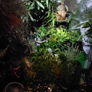 温室内へ避難🌿 台風接近で、大切な植物たちを保護しています🎵 ブーファン、チランジア、グレビレア、プロテア等々…をサーキュレーター2台を入れてのフル稼働です😂 窮屈だけど、しばしの間、耐えてくださいね~(o^-^)尸