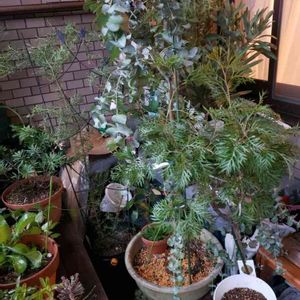 台風対策🍃🌀☔ 温室にも室内にも入りきれない植物たち🌿 ユーカリ グレビレアゴードン リトルプリンス グレビレアセンパーフローレンス 手前にレモン🍋 台風が早く過ぎ去って欲しいだけですね😖💦