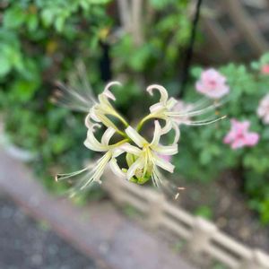 シロバナマンジュシャゲ (白花曼珠沙華・リコリスアルビフローラ) お隣のフェンスの向こう側に咲いている白い彼岸花💫 科名:ヒガンバナ科 属名:ヒガンバナ属 開花期:9~10月 花言葉:また会う日を楽しみに 🍃2021年秋彼岸 9月20日~20日