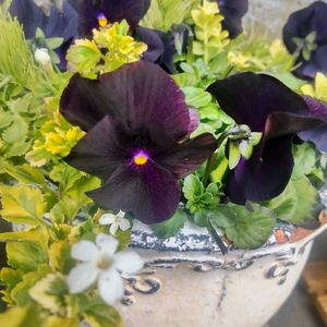 ブラック繋がりで載せてみました ビオラのノーブランドのブラック 寄せ植えした斑入りのバコパの白い花も少し咲いてます