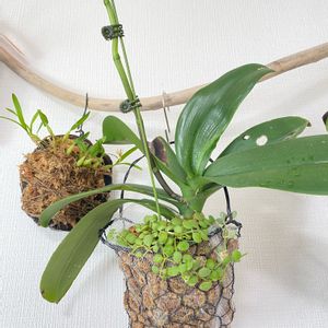 100均のフンキアナ 着生植物の寄せ植えにしたら、水苔から水分補給してるので、葉が開いてる。