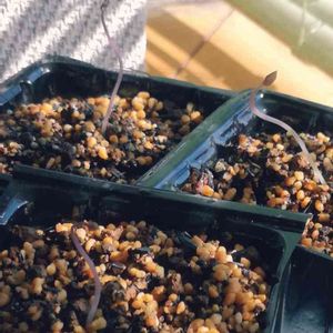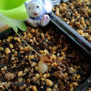 研究員、パピー・ダックよりの報告。 これはアフリカ亀甲竜の種です。 ちなみにこの種は今年7月に蒔いて、全く芽が出なかった子たちです。 数日前、掘り出してみて、芽の出る気配が全くなかったので、思いたって、メネデール液に浸けてみました。 するてーと、 2個は根っこが出てきました❗ もう2個も、発根の兆しが🎵 o(^-^o)(o^-^)oわーい🎵 亀甲竜の芽だしがうまくいかない‼️って方は最後まで諦めないでいただきたいです。 私からの報告は以上です。