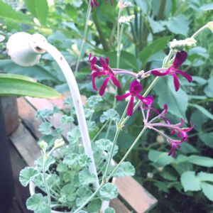 ベラルゴニウム シドイデス 原種系のベラルゴニウムなんですね。 濃い紫の小花に一目惚れ。 シルバーの葉にも😄 風にゆらゆら揺れる姿も好き💖