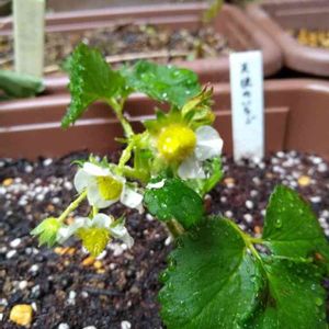 畑の隅っこに置いてある作った苗の白イチゴの花が咲いていました!今はまだ実ができる時期じゃないけど、ʚ(虫)ɞ〜 ブーンさんがいないので私が細筆で撫でてあげました。(人工授粉)