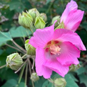 今日のお花🌸フヨウ🌸 1️⃣芙蓉 🌸アオイ科 フヨウ属の落葉低木 中国原産 雌蕊の先が曲がる特徴がある 葉は手のひらの形で浅く3〜7に裂ける 枯れた後の姿も印象的で「枯芙蓉」と言う 昔から美しい人の例えとして用いられ、美しくしとやかな顔立ちを「芙蓉の顔」と言う 8/9山の温泉地で 2️⃣3️⃣タカサゴフヨウ(高砂芙蓉) 別名 ヤノネボンテカ(矢の根梵天花) 草本性低木で南アメリカ原産 湖周りの湿地で 4️⃣スイフヨウ(酔芙蓉) 朝には白、昼はピンク色、夕方には紅色になる事から酔っぱらっている様に見える事が名前の由来 中国原産の落葉低木 川沿いで 🌸いずれも一日花で朝に咲き夕方に萎む花