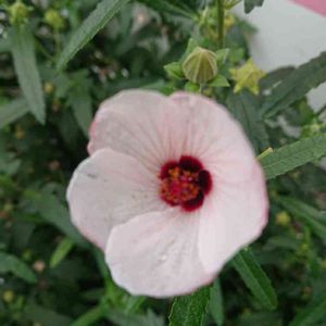 10/9(火)② タカサゴフヨウ マンションの庭で、アメジストセージに押され気味な中、健気に咲いていました。 直径5cm位の花は裏側のストライプも蕾も可愛らしいです😃🎶