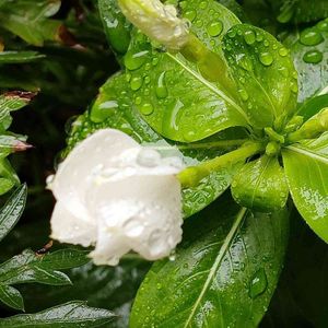 小雨の降る涼しい朝 クチナシの花は、雨も気にせずに😁 🎶雨上がりの庭で、クチナシの香りのやさしさに包まれたなら、きっと、目に映るすべてのことは、メッセージ🎶(byユーミン) そんな歌詞を頭に浮かべながら、自分の気持ちをアップ⤴させて…,(*˘︶˘*).。*