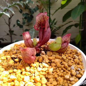 個性的なものに惹かれます😄 お店に有った3種類のサラセニアの中で、ずんぐりしているこれが気に入りました💓 正確には「サラセニア・プルプレア・南方系亜種ベノサ」らしいです。 育て方を検索したらサラセニアの中でもプルプレアだけは雨水を貯めて利用するそうで、シャワーで上から水をかけて大丈夫とのことなので水やりが楽です。 上手く育てられると良いな😌