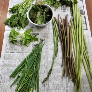 今日の収穫 1⃣ツワ、フキ、アスパラ ネギ、ミツバ、ぶどうの葉 サラダほうれん草、 チンゲン菜 2️⃣ヨモギ、春菊、大葉春菊 フリフリレタス、紫レタス 紫エンドウ、美笹エンドウ スティックサラダ 3️⃣フリフリレタスと 紫レタス 4️⃣春菊と大葉春菊、スティックサラダ スティックサラダは収穫は今日で最後かな硬くなってしまったから 大葉春菊も花芽がたくさん また種をとって終わりかな。 5️⃣今日の夕食 ・ぶどうの葉のゴマ和え 天ぷら以外で1番美味しいかも ・フリフリレタスとミツバのサラダ ・ニンニクの芽と スティックサラダの モツの味噌煮 ・野菜ス-プ ・酢タマネギ