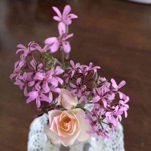 ミニバラとペラルゴニューム ベランダのバラの夏剪定が終わりました。ミニバラとずっと咲いてるペラルゴニューム。