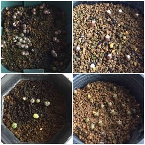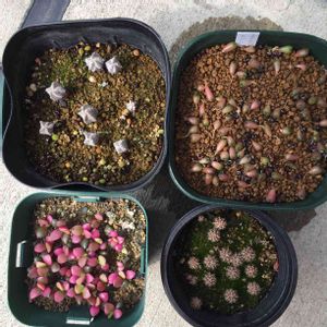 実生の日〜という事で、今月は忘れずに実生っ子達をpostです❗️(笑) 左上…桜吹雪 少し減っちゃったかな❓ なかなか本葉が出てこないので暖かい室内管理に変更しました。 右上…鸞鳳玉 こちらは8個全員無事ですが、赤い〜💦 室内でも寒いかな❓と密封容器を簡易温室がわりにしています。 左下…リトープス ひとつ減って7個に。 でも一番上の一番小さいコがヤバそう😱 こちらも寒すぎかな❓と簡易温室がわりの密封容器に入れ、2日ぶりに保湿のラップを外したら大きくなったのか徒長しちゃったのか、みよーんってしてました(笑) 右下…巻雲 こちらもひとつ減って16個に。 この子達は密封容器に入れたら少しずつ緑色に戻ってきました✨ 温度管理や水やりのタイミングが掴めません💦 春にはエケベリアの種蒔きも控えているのに、大丈夫かな😞
