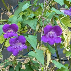 散歩道に咲いてます つる性で朝顔のようでもあるし? 初見👀のお花かな? 💜アサリナ💜フジスダレ💜 オオバコ科(ゴマノハグサ科)キリカズラ属 開花期7〜11月 つる性植物 一年草 キンギョソウに似たベル形の花です