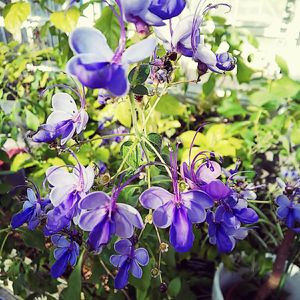 庭の植物に飛んでくる蝶々たちに負けずとも劣らないかわいさで咲いてます💜ブルーウィングさん❣️ ただいま5つ開花中☺️花びらがちょっとチョリっとなっちゃってるけど、大丈夫なの😂 あっちこっち向いてるから、写真が撮りづらい💦💦💦