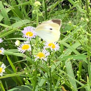 散歩道 川沿い(^^) ヒメジョオンにモンシロチョウ 過ごしやすい気温で蝶も軽やかに仕事中です。