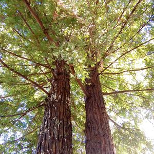 【センペルセコイア①】 千葉公園にある センペルセコイア 一本の木ですが、根元に近いところで二つに分かれたあと、二本とも、まっすぐ伸びており、とても美しい樹形です。 メタセコイアは、化石で発見された当時、センペルセコイアに似ていることから、その名が付けられたそうです。 私は、仙台でメタセコイアに魅了されたあと、千葉に来て、その名前の由来の基になった樹木に出会い、感動しました。 メタセコイアは落葉樹、センペルセコイアは常緑樹ですが、どちらも、お気に入りの樹木です。 ちなみに、世界一高い木は、米国カリフォルニア州にあるセンペルセコイアだそうです。