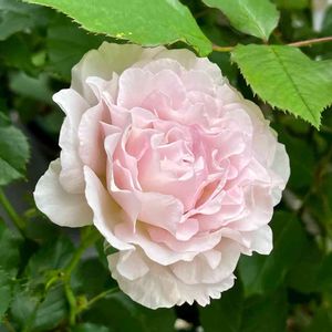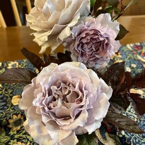 薔薇 ニューウェーブ 旅から帰ると、雨の中満開に✨ 10センチはあるお花が、雨を抱いて花首うなだれていたので、カットしてお部屋へ。 ベニバナスモモの葉を添えて🍁