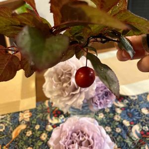 就寝前にもう一枚🤗 先ほど投稿したニューウェーブ添えとして庭から切ってきたベニバナスモモ。 おやおや、偶然にも実がついている枝でした😳 可愛いから、このままいけています🥰 おやすみなさい💤