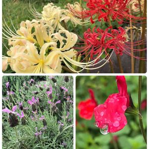 季節はバラバラ昨年撮ったもの。黄色の彼岸花を初めて見ました✨←お出かけ先 ラベンダーはプランターからこぼれた種が自力でここまで育ちました٩(ˊᗜˋ*)و チェリーセージは雫があまりに可愛かったので♡
