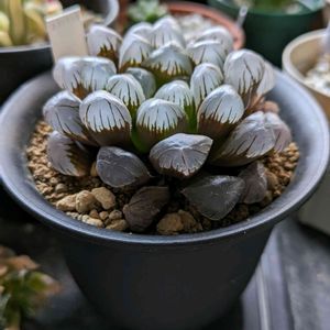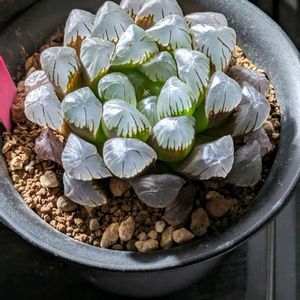 冬の柔らかな陽射しを浴びてる 姿をパシャリ📸 透明感のある窓と赤紫色の肌が 優美な子です♪☺️🌵 無事に冬越しできますように👏