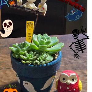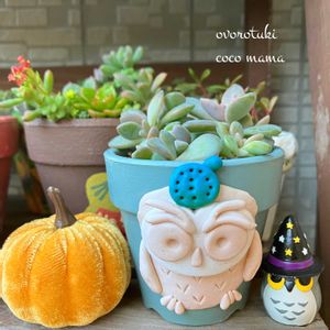 🏷️フクロウ祭り🦉 🏷️幸せを呼ぶフクロウ祭り🦉 🏷️ハロウィン月間🎃 参加しま〜す|*ˊᵕˋ*)੭⁾⁾ 葉挿しで大きくなった朧月さん✨ フクロウもハロウィン仕様🎃🦉 ハロウィンもうすぐ終わりだね🤣