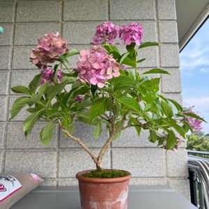 本日は、「アジサイ(古代紫)」をご紹介します。 ①2017年GWに開催された大盆栽まつりにおいて、上野グリーンクラブの店舗ブースで購入したものです。親木からの切り枝を揷し木したという苗木でした。 古代紫(コダイムラサキ)という品種に魅力を感じての購入でした。当時の写真はありません😭が、育成から8年が経ちました。^ ^ それぞれの花は咲き始め時期差があるため、終期をギリギリ迎えたものもあり、色合いが違うのがわかると思います。しかし、これもまたいい。^ ^ 樹高55センチメートルの1株もので、毎年剪定して枝分かれに力を注いでいたため、ワイヤー、リング(支柱)等は一切掛けずに育ててこれました。しかし育成途中には、台風等の風で枝が折れてしまったことも…😭 ②樹の古さも出てきたようです。 地表面から最初の枝分かれ部分の剪定時に残した枝跡は、ほぼ無くなりました。 今は植木鉢ですが、いずれは盆器へと引っ越させたいと考えています。盆栽としての醍醐味である大樹に観える日がくることを夢みて。笑 ③ 今まで剪定に力を注いでいたので、開花数は多くて4輪が最高でした。しかし、今年は開花させるために剪定を控え、なんと1株に11輪の花数が! やったー大記録!🙌 ④ 古代紫という色にしては結構明るめの色ですね。土壌の性質でしょうか…。できることならば、もう少し青めの色が混ざるといいなぁ。🤔 ⑤2020.6に撮影したもので、購入から3年経った頃、ポットの苗を植木鉢へと植え替えた頃です。🪴 これがハッキリと写された1番古い写真なんです。 私の住む地方は梅雨時期が間もなく開けるようですが、と同時に開花時期も終わりを迎えています。 花後は来年以降に備えて、花から2〜3節目をバッサリと切りますので、おそらく来年の開花は恵まれないでしょう。 ともあれ、我が古代紫くん、トキメキをありがとう!^ ^ 再来年またお会いできたら光栄です。 切った花は吊るし干しにしてドライフラワーにでもしようかな…