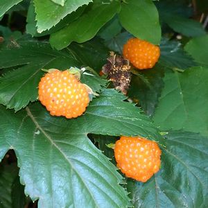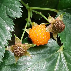 カジイチゴ(梶苺) 果実 *バラ科キイチゴ属 花期は4〜5月 果期は5〜6月 宮城県.秋田県以南の海岸や海に近い山地の林縁に生える落葉低木! キイチゴ類の中ではほとんど棘が無い! 葉は互生し掌状に3〜7裂け! 海岸沿いに大きめ果実が美味しそうな色に熟しています! ④は白い大きめの花! 一粒 味見をしましたが 甘かったです❣️ ・ネットの情報では関東以西とするものも多いのですが、宮城県の海岸沿いには多く見られます! 6月12日撮影 宮城県七ヶ浜町