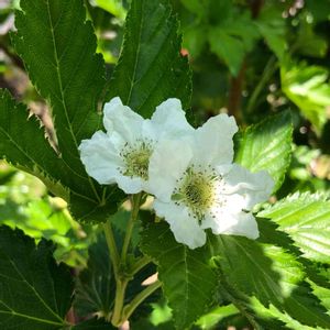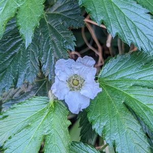 こんにちは😊カジイチゴの花、咲いてます😊今朝の放ったらかしガーデンにて。この木、めちゃ大きいのだけど、花🌸と実は可愛い💕実は食べられるのかな⁉️